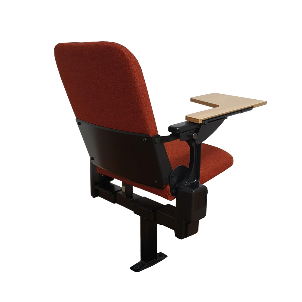El atril de escritura en su versión estándar tiene un ancho en su parte frontal de 26 cm. y de 31 cm. en su versión “large”. Esto permite que esta butaca aporte una amplia y rígida superficie de trabajo facilitando la utilización de ordenadores portátiles. Versiones para diestros y zurdos, que cabe combinar en la distribución de los atriles en cada una de las filas.
